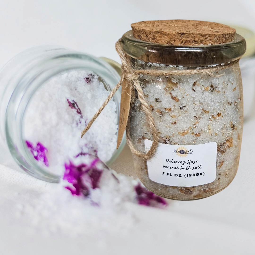 Indulge in the luxurious and soothing experience of our Rose Scented Bath Salts, elegantly presented in an apothecary bottle with a bamboo topper. Designed to elevate your bath time into a calming and relaxing ritual, our bath salts are infused with the enchanting aroma of Lavender, and Rose essential oil, complemented by the delicate presence of rose petals.
